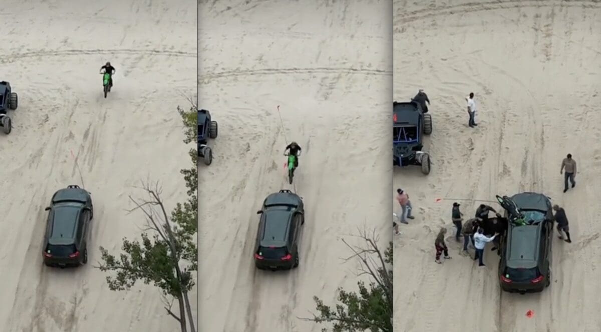 GRAND RAPIDS, Michigan – Jeep driver Gavin Plume and dirt biker Josh Vodry are both lucky to be alive after a disastrous head-on collision in Silver Lake Sand Dunes near Grand Rapids, Michigan. According to WoodTV, Plume was taken to the hospital following the crash, but was later released, while Vodry suffered a compressed fracture of his L2 vertebrae, small lung puncture, and a concussion, though he is expected to recover.