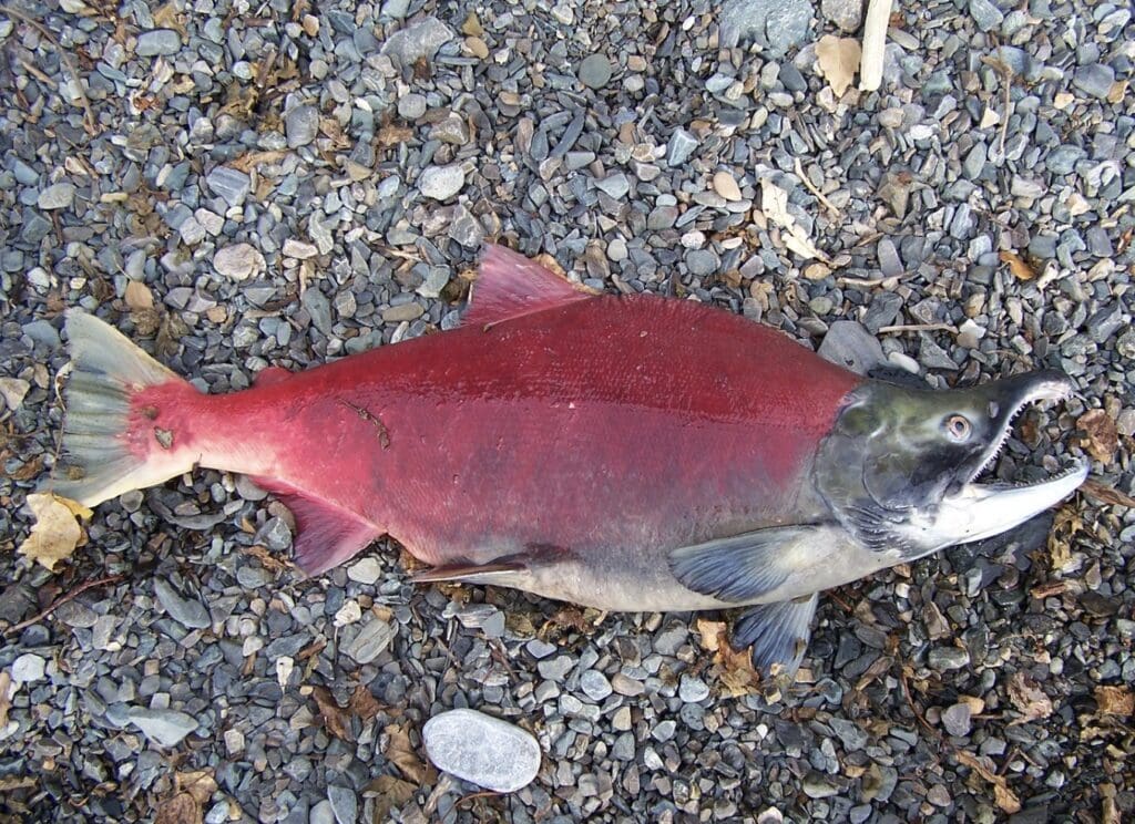 When sockeye salmon return upriver to their spawning grounds, their bodies turn a striking red color and their heads become greenish. Breeding-age males develop a humped back and hooked jaws filled with visible teeth.