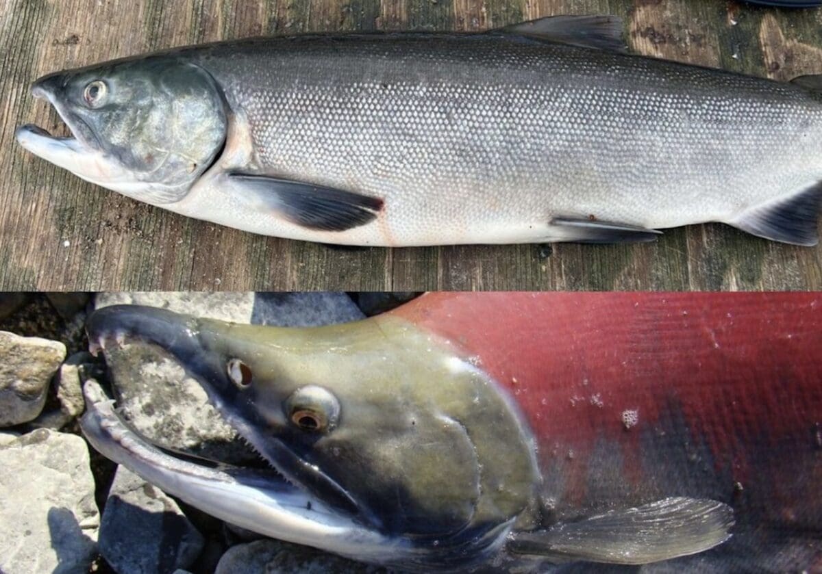 When sockeye salmon return upriver to their spawning grounds, their bodies turn a striking red color and their heads become greenish. Breeding-age males develop a humped back and hooked jaws filled with visible teeth.