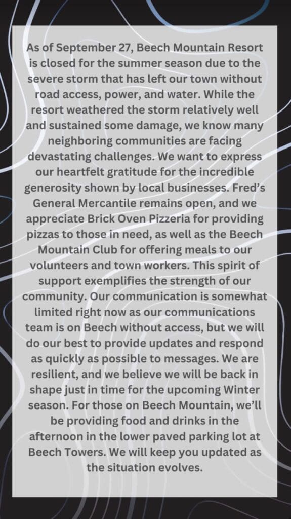 On Sunday, Beech Mountain Resort provided a statement regarding Helene. The North Carolina ski resort is dealing with some damage but held up “relatively well” overall.
