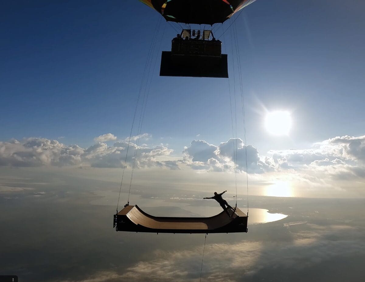 Skateboarder and athlete Jay Alvarrez and pro skydiving camera flyer Sergey Ignatov worked together to create what might be the wildest skateboarding clip you’ll ever see. On a ramp suspended 10,000 feet in the air by a hot air balloon, Jay Alvarrez does a bit of boarding before he jumps off. At the same time, Ignatov is suspended in the air by what appears to be a rope, capturing a shot of the clip from the coolest angle.