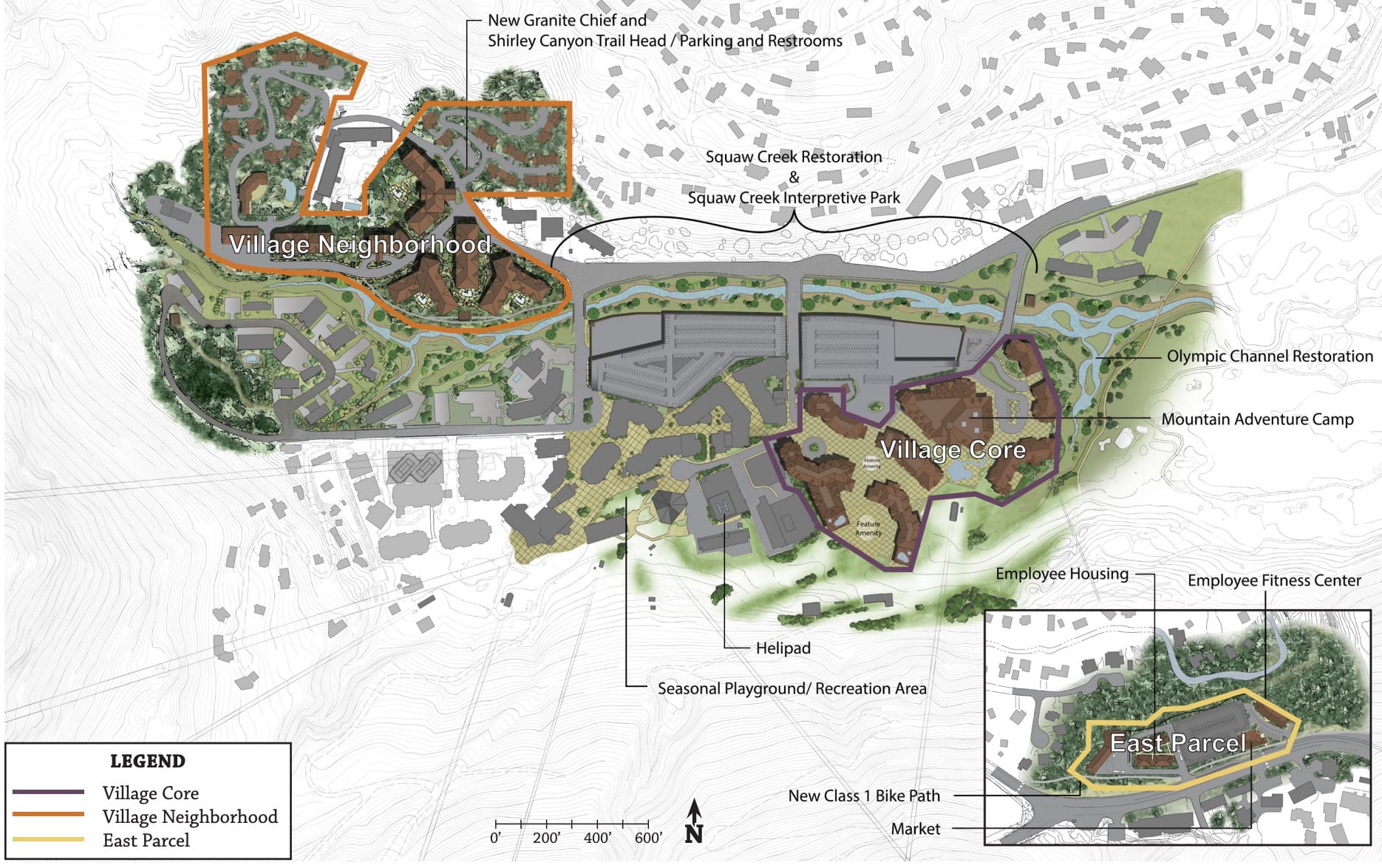 Palisades Tahoe has a village, albeit a small one. The California ski resort, which is owned by the Alterra Mountain Company, is envisioning a vast village expansion that would provide more beds and services at the ski resort. This expansion would add two separate villages that total 85.5 acres. This would include 297,733 square feet of commercial space, a 90,000-square-foot building for recreation, and up to 850 residential/lodging units, which would potentially feature 1,493 resort bedrooms. A third parcel would add 386 employee housing units, a fitness center for workers, a community market, and a shipping and receiver port.