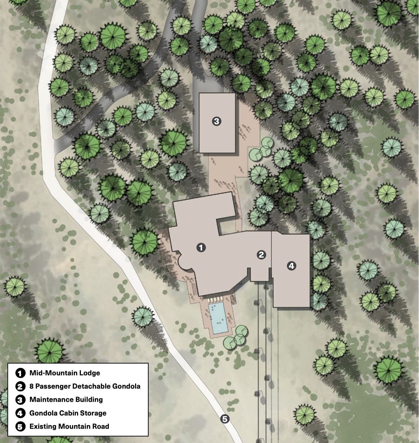 On-Mountain Facilities: A new lodge could be next to the top terminal of the gondola. This would include food and beverage outlets, a sundries shop, and restrooms. An outdoor recreational pool would be open to the public in the summertime.
