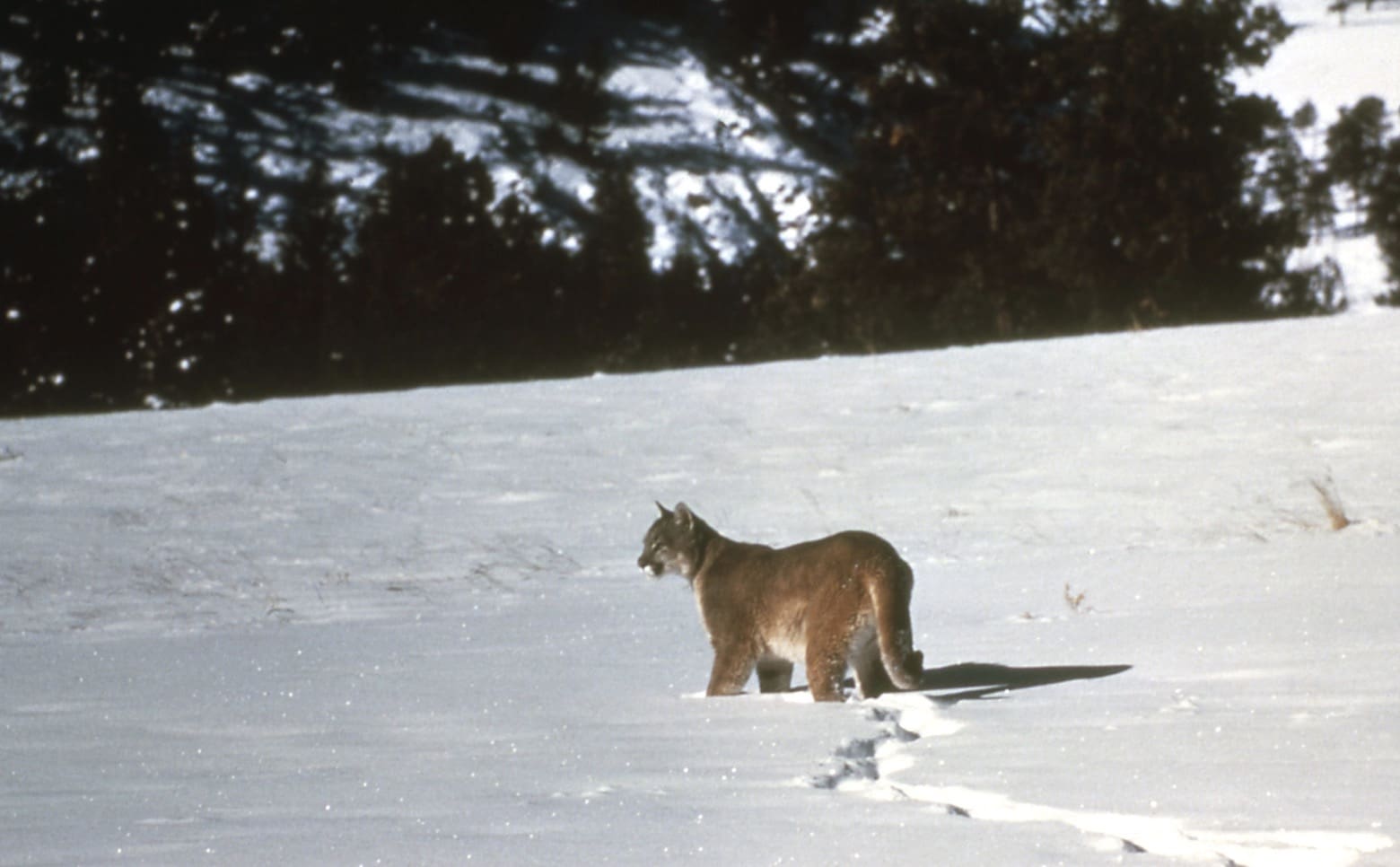 The cougar (Puma concolor), also known as mountain lion, is the one of the largest cats in North America and a top predator native to Greater Yellowstone. (The jaguar, which occurs in New Mexico and Arizona, is larger.) As part of predator-removal campaigns in the early 1900s, cougars and wolves were killed throughout the lower 48 states, including national parks. Wolves (Canis lupus) were eradicated and, although cougars were largely eliminated from Yellowstone, the species survived in the West because of its cryptic nature and preference for rocky, rugged territory where the cats are difficult to track. Eventually the survivors re-established themselves in Yellowstone in the early 1980s, possibly making their way from wilderness areas in central Idaho.