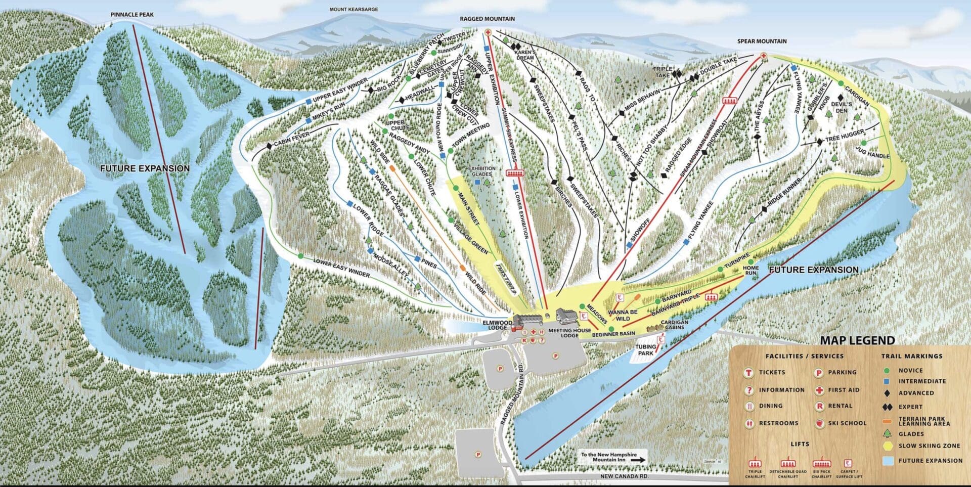 Ragged currently features 57 trails and glades on 250 skiable acres, five lifts, and a vertical drop of 1250 feet. Its base area features three core buildings: a ticket office, the four-story Meeting House Lodge, and the three-story Elmwood Lodge. There are also various parking lots leading up to the mountain.