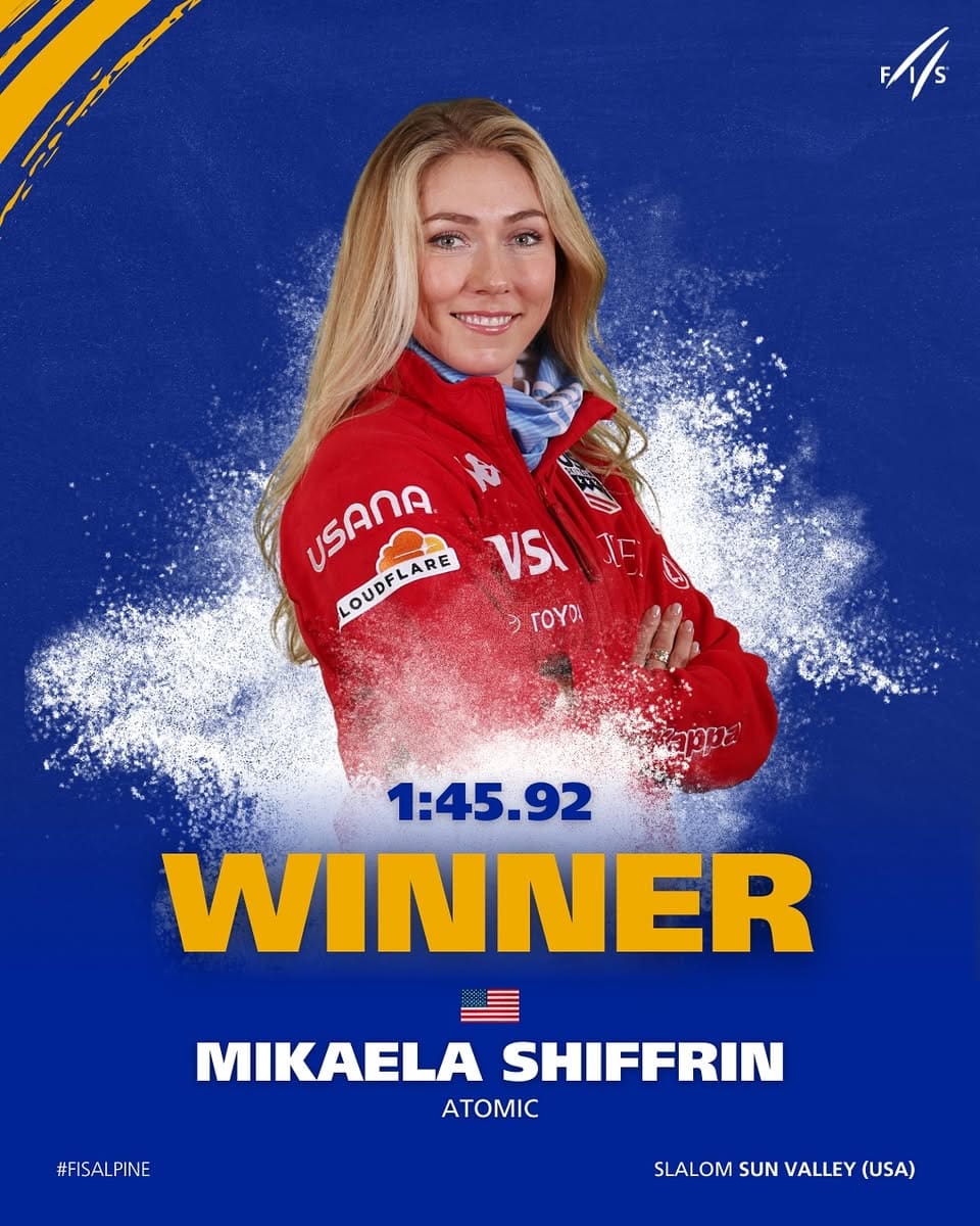 With little kids dressed as the 101 Dalmatians in the stands, Mikaela stepped on the gas and won the slalom in Sun Valley by a comfortable 1.13 seconds. Congratulations to Mikaela who further cemented her status as the winningest skier of all-time!