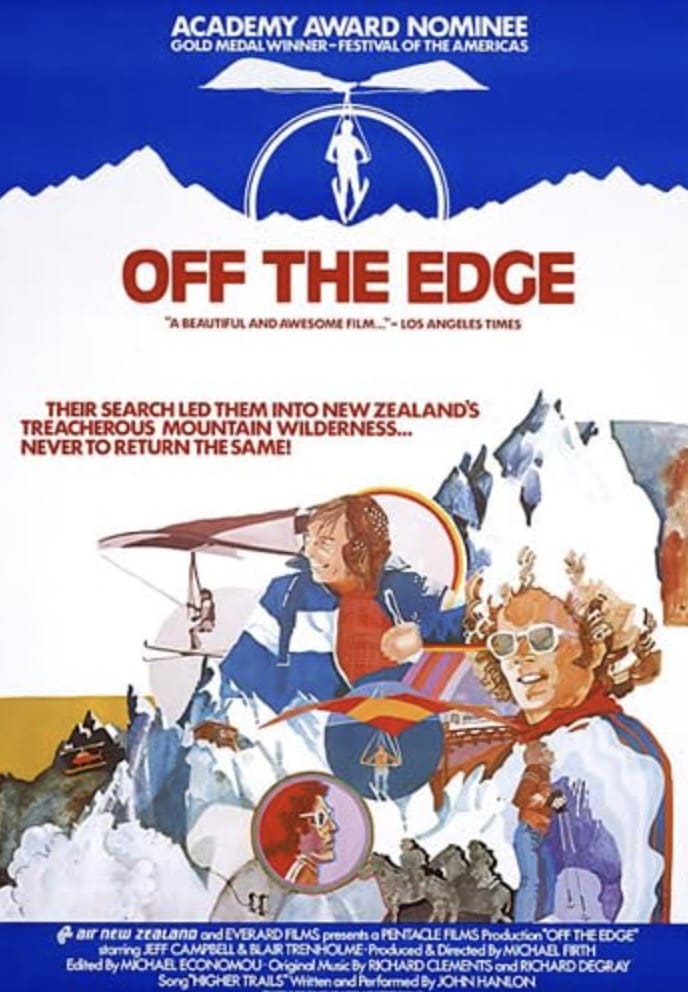 Off The Edge debuted in 1976 and was nominated for an Academy Award. The film follows two buddies, Jeff Campbell and Blair Trenholme, who backcountry ski tour and fly around the some of the highest peaks of the Southern Alps in New Zealand in jeans and sweaters.