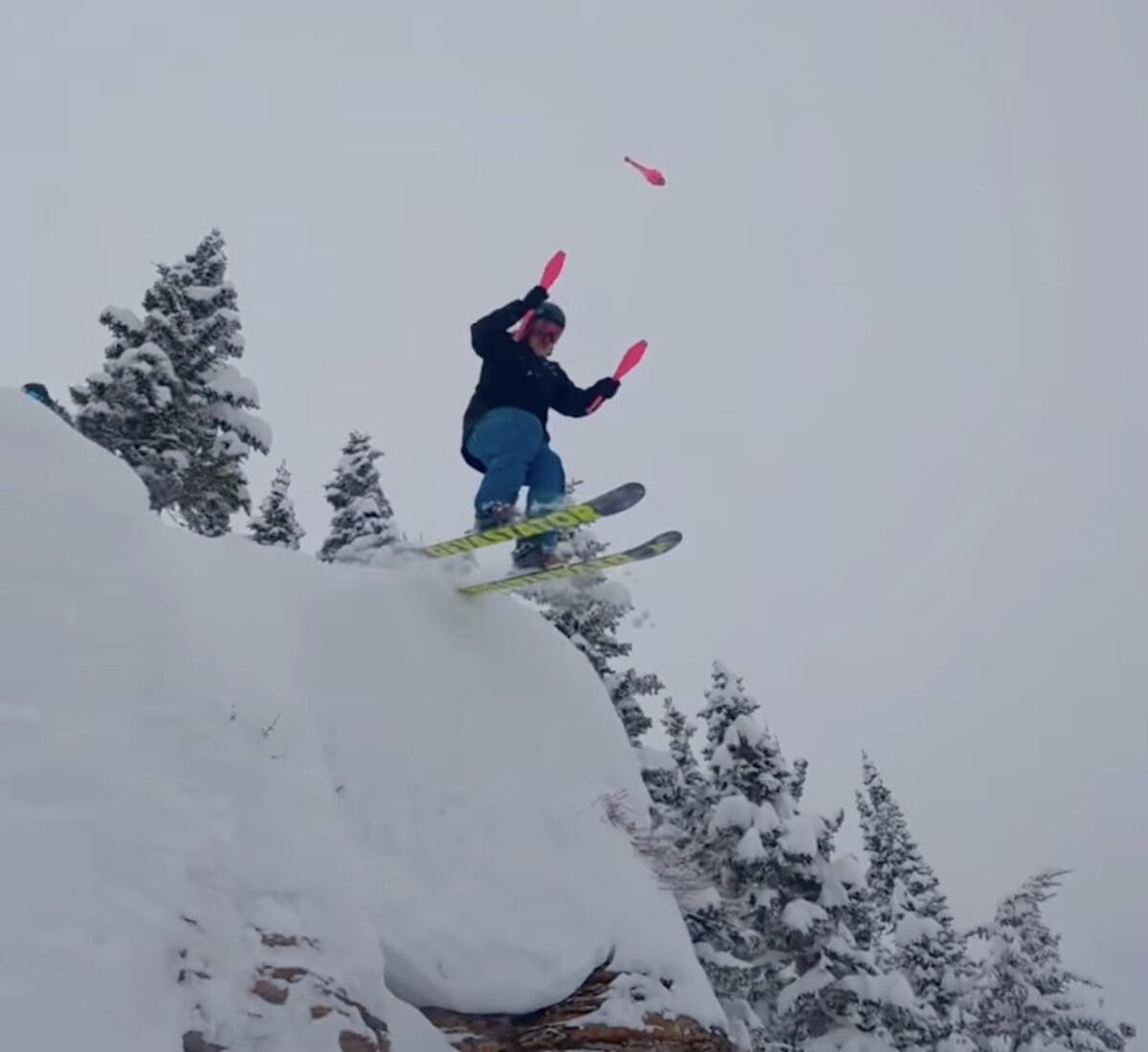 The Teton Juggler spends his season riding around with juggling clubs on a relentless pursuit to push the boundaries of what is possible for this unique hybrid sport. Every winter he posts his feats of alpine coordination for his 235K followers to appreciate and this cliff drop skuggle ranks among the best: