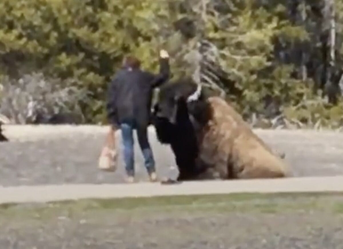 Despite bystanders warning the woman “you’re going to get killed” she continued to touch the bison on the head, provoking it to stand on its forelegs and shake its head in response to the unsolicited contact. This woman is very lucky her repeated provocations didn’t end with an attack unlike the 47-year-old man from Cape Coral, Florida who was gored by a bison over the weekend after approaching too closely.