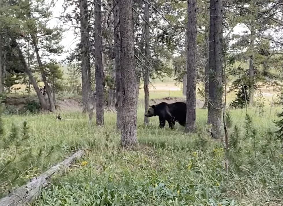 Yellowstone National Park requires that visitors keep at least 100 yards from bears at all times. In the event of a bear encounter, you should back away and talk in a calm voice, making it clear to the bear that you are a person like this guy does. Hiking in groups and making noise is highly recommended to avoid bear encounters in the first place. Read more on bear safety below.