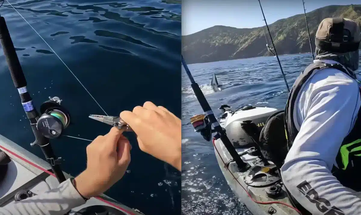 Matthew Wells was documenting his fishing trip for his YouTube channel when he noticed an ominous shadow approaching his vessel. The telltale great white large dorsal fin emerged as Wells cut the live bait he was using and furiously paddled for safety: