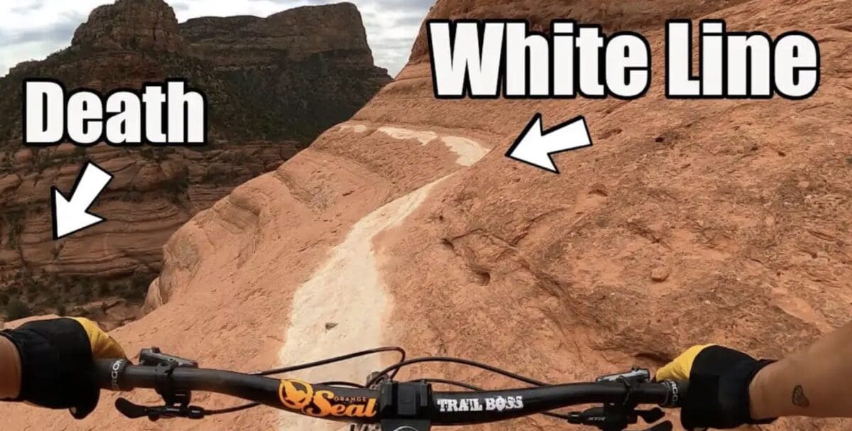 Harrowing moment caught on camera as Jeff Lenosky nearly bought the farm riding the The White Line in Sedona, Arizona. The light colored sandstone line has a reputation as “the world’s most dangerous trail” and it’s easy to understand why.ย Glad Jeff was able to recover and gave thanks to his “human safety net”ย who was positioned to bodycheck him if things went sideways. Thankfully he was able to correct his mistakes and secure a clean line.