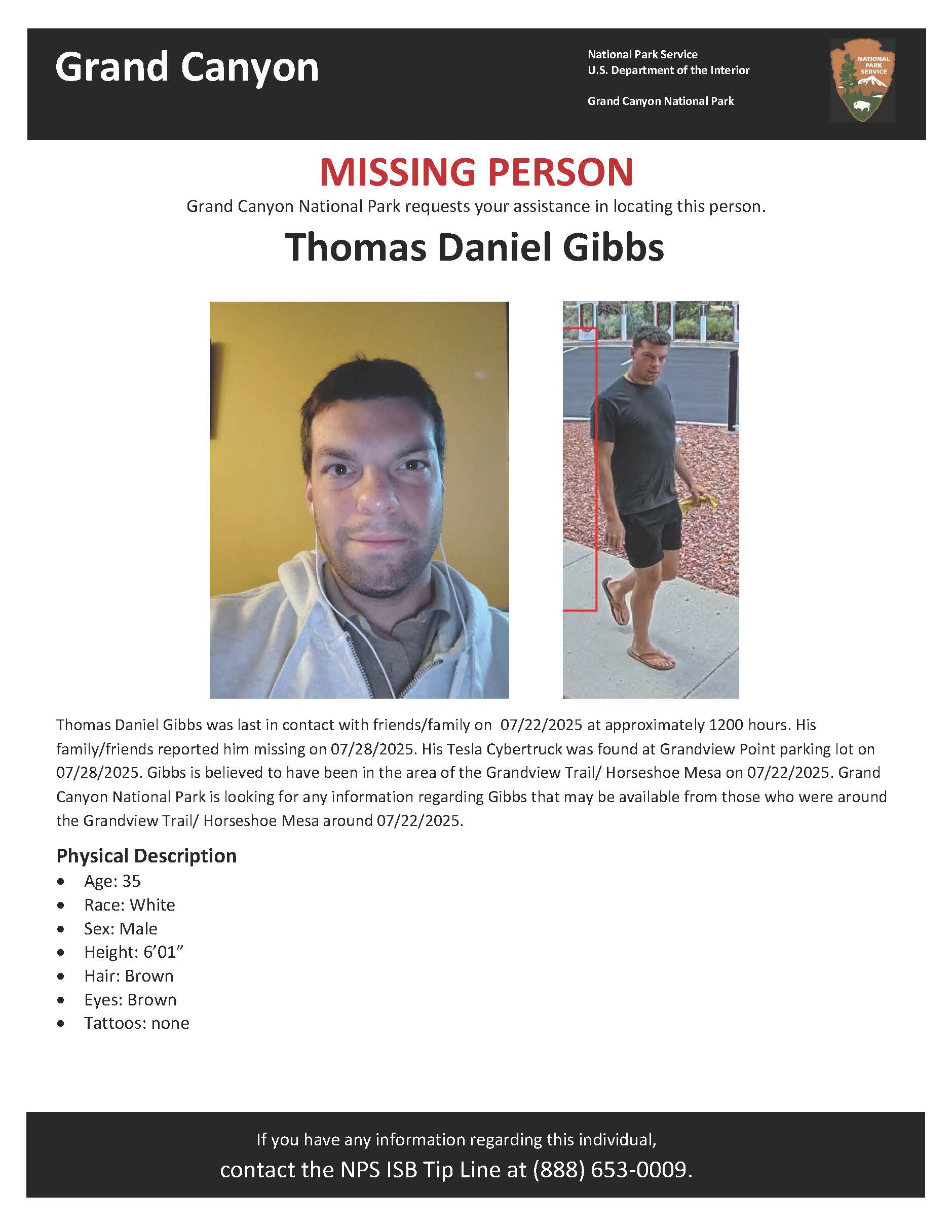 Grand Canyon National Park is asking for the public’s help in locating a 35-year-old New Jersey man who was last heard from on July 22nd, 2025. Family and friends reported Thomas Daniel Gibbs, of Freehold, New Jersey as missing on Monday, July 28th.