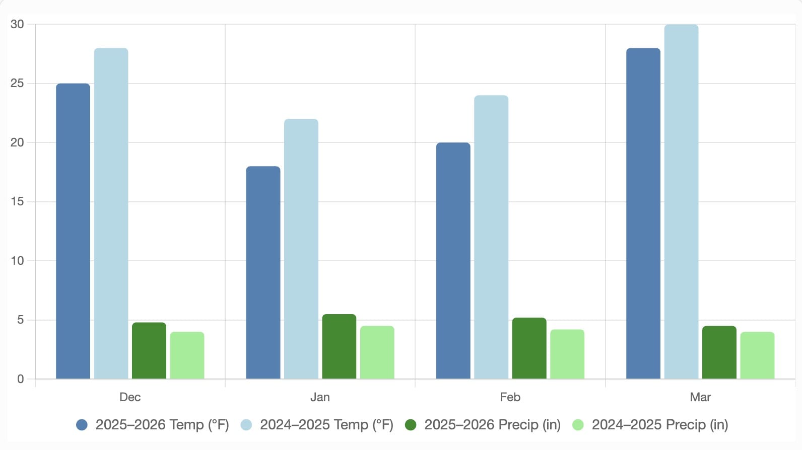 2025–2026 Forecast: A warm, wet winter with temperatures 3–5°F above average and 20–25% more precipitation, mostly rain. Snow will be rare, with storms in January and March. 2024–2025 Recap: Last winter was cooler (near average) and drier, with minimal rain and no significant snow. Key Differences: This winter will be 2–4°F warmer and wetter (18–22 inches vs. 14–17 inches last year), making skiing nearly impossible.