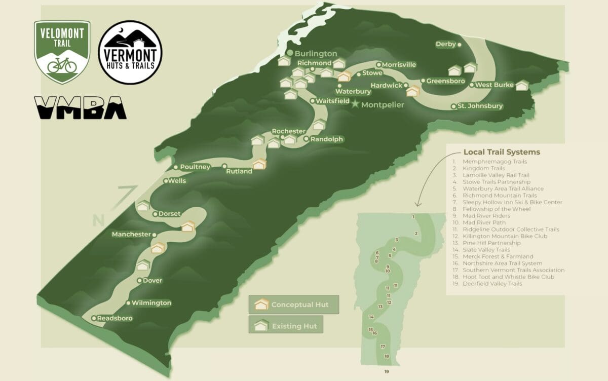 The Velomont Trail is a shared project between Vermont Huts & Trails and Vermont Mountain Bike Association (VMBA) for a multi-use, hut-supported trail system, optimized for mountain biking, that will run the length of Vermont. The expansive trail network will consist of 485 miles of new and existing trail, connecting 23 Vermont mountain biking chapters across public and private lands, linking 27 communities across the state, while employing and training 330 young adults as they build 30 new huts and five new downtown hostels.