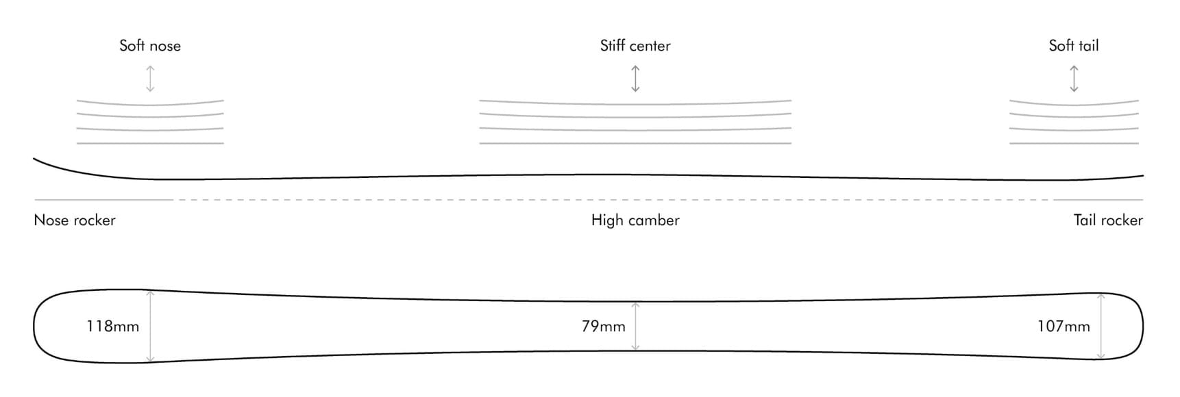 Innovative design, which blends the turn stability and speed of a traditional flat tail shape with a generous amount of perfectly calculated tail rocker, engineered to reward pivots and slashes. Stable to ski at high speeds, playful and easy to initiate turns at lower speeds โ this shape exceeds expectations.