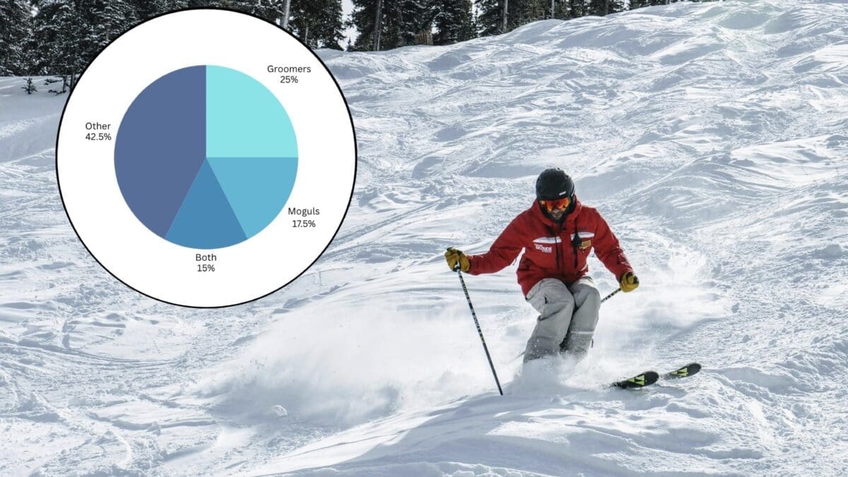 17.5% of responses, however, pointed toward moguls over groomers. For a few people, the lack of crowds on mogul runs pulls them toward the bumps, while others are looking for as much of a workout as possible when on the mountain. Some skiers even pointed out the lack of snowboarders you find on mogul runs…