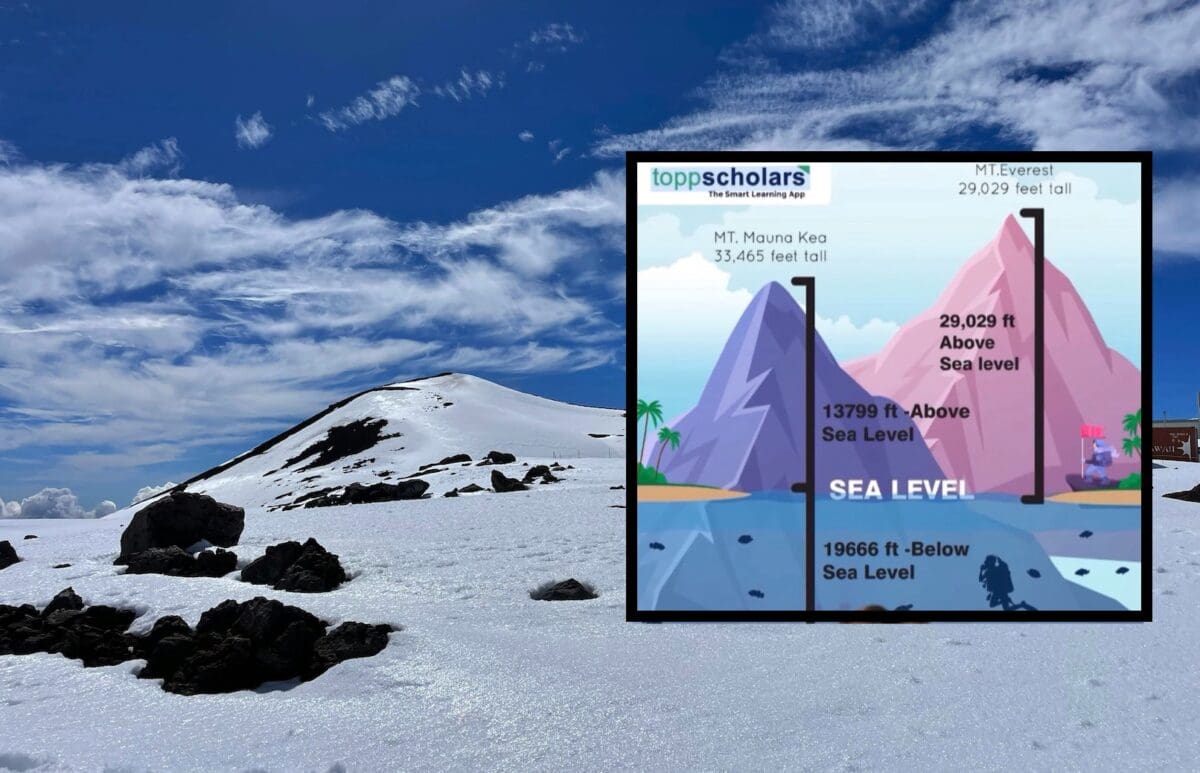 Visual: A cross-sectional diagram showing Mauna Kea rising from the ocean floor to its summit (13,803 feet above sea level, ~33,000 feet from the ocean floor). The diagram highlights the ambiguity of the โbaseโ with question marks at various ocean floor depths.