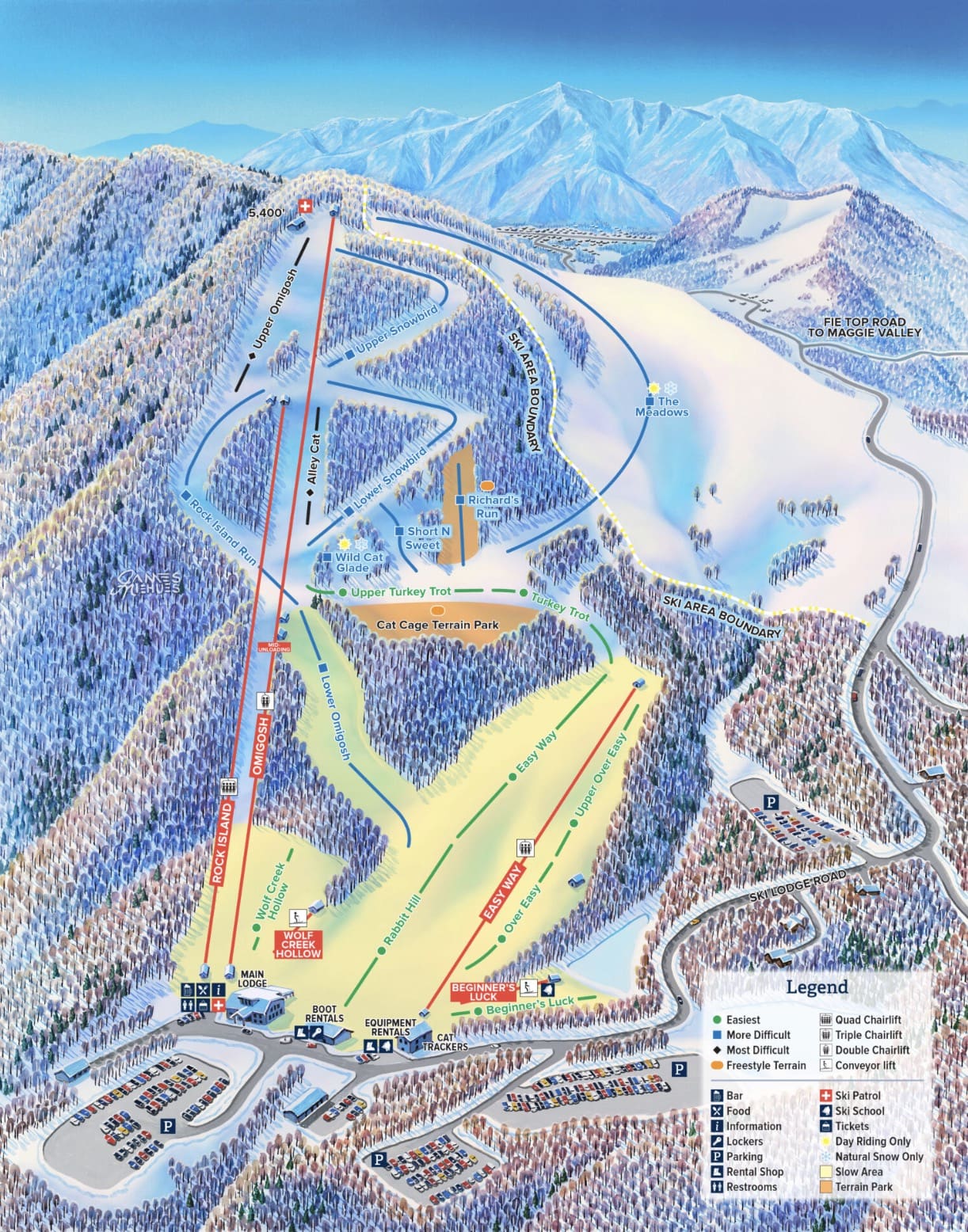The Omigosh chairlift is Cataloochee’s sole lift to the summit. This means it’s the only way to reach the Upper Omigosh, Upper Snowbird, and The Meadows trails. Like its predecessor, there is a mid-station that will service the intermediate Lower Omigosh piste, which leads to the Rabbit Hill trail.