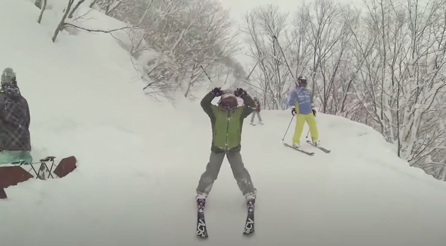 Not sure if this young man is clairvoyant but tossing up the ski pole horns just prior to the near miss at the very least serendipitous.