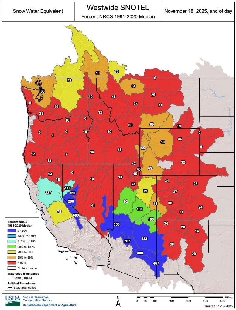 In stark contrast, the Pacific Northwest, Great Basin, and northern Rockies are off to a dismal start. Washington, Oregon, Idaho, Montana, Wyoming, Utah, and most of Nevada and Colorado are bathed in orange and red, with many basins at 50-89% or below 50% of median — some showing 0% or no measurable snowpack yet. This slow buildup raises concerns for water supplies, wildfire risk next summer, and ski resort operations heading into the holiday season.