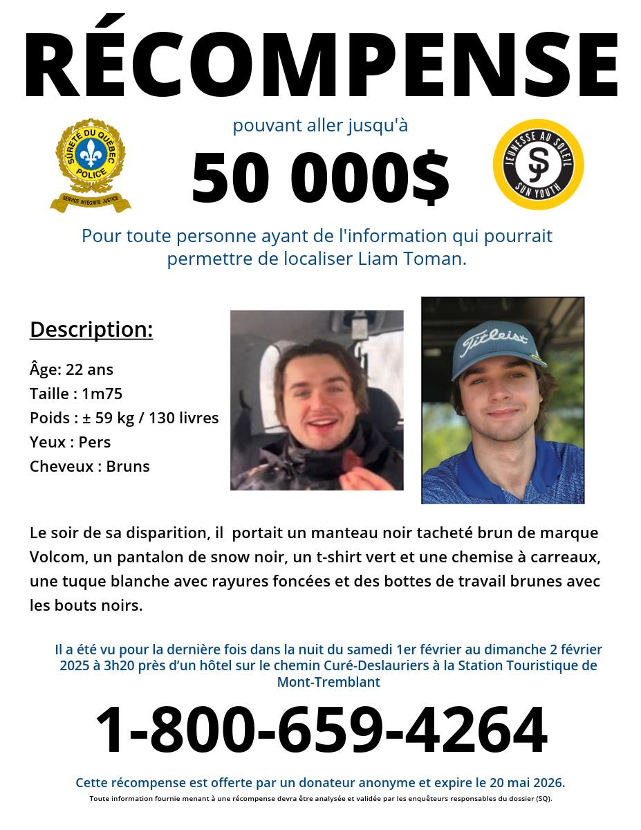 The reward money was put up by anonymous donors and will be in effect until May 20th, 2026 to anyone who helps locate the missing man. Anyone with information is asked to call the SQ’s info-centre at 1-800-659-4264.