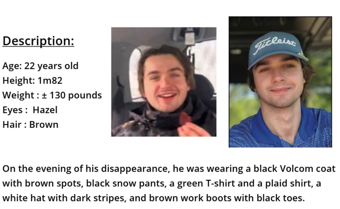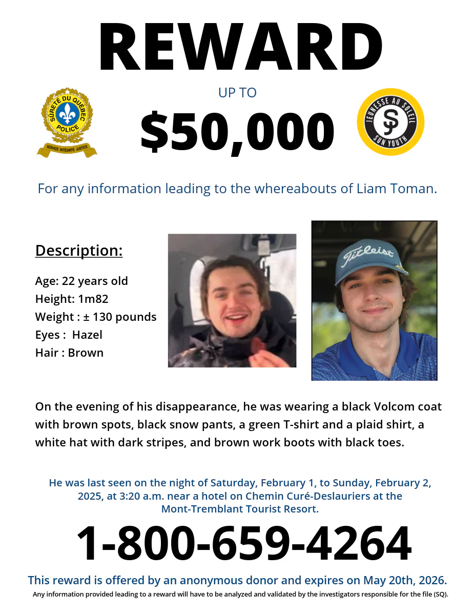 Liam Gabriel Toman, 22, was last seen around 3:00 am on February 2nd, 2025 leaving a bar on Curé-Deslauriers Road after a night out with friends in Mont-Tremblant. He is described as 5′9″, weighing 130 pounds with brown eyes and brown hair. He was last seen wearing a black Volcom coat, black snow pants, a green sweater and a plaid shirt with a white hat with dark stripes.