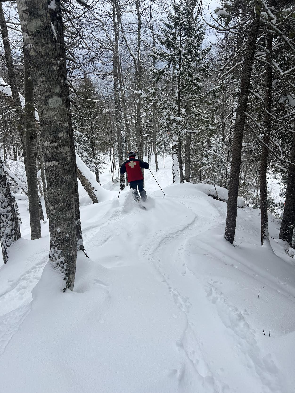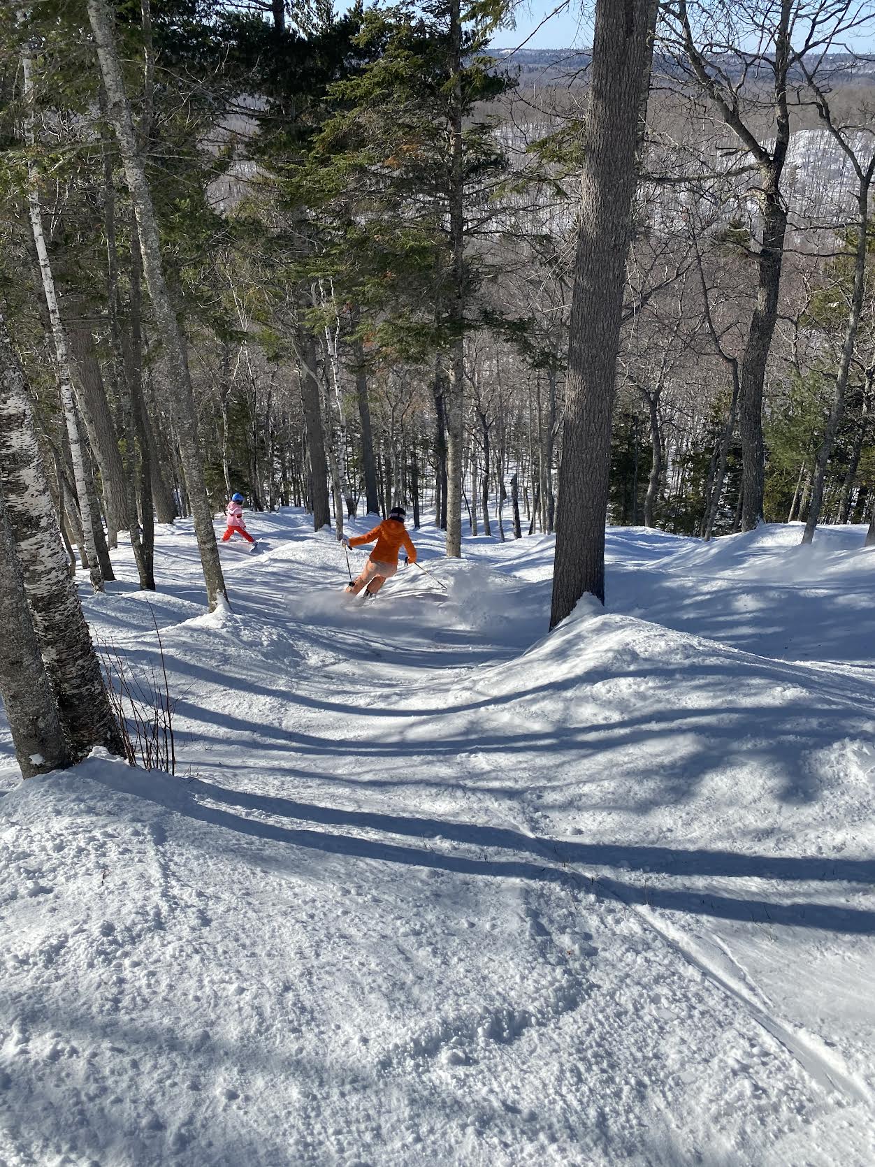 The crown jewel of Mount Bohemia is its middle section called The Extreme Backcountry. This section resembles western backcountry terrain with its steepness and multitude of natural features. Inside this expansive section is long steep gladed runs, chutes, and some big cliff drops. The middle of the Extreme Backcountry features Bohemia’s famed chutes and cliff drops. Horseshoe Chute has a side door for those looking for an easier entrance or when it is a powder day the most daring step up to the 40 foot cliff drop. Apex Chute right beside it offers much of the same, with another large cliff drop. To the left of the cliff drops is Flying Squirel and Sleepy Possum, two very steep but very well spaced out glade runs. For those looking for less adrenaline rush but want really long tree skiing with excellent fall line then go to the right side of the Extreme Backcountry and check out Brown Beagle and Woodpeckers Hollow. All of these runs bring you to the road where Bohemia’s shuttle buses operate all day long to swiftly return you back to the triple chairlift on the frontside.
