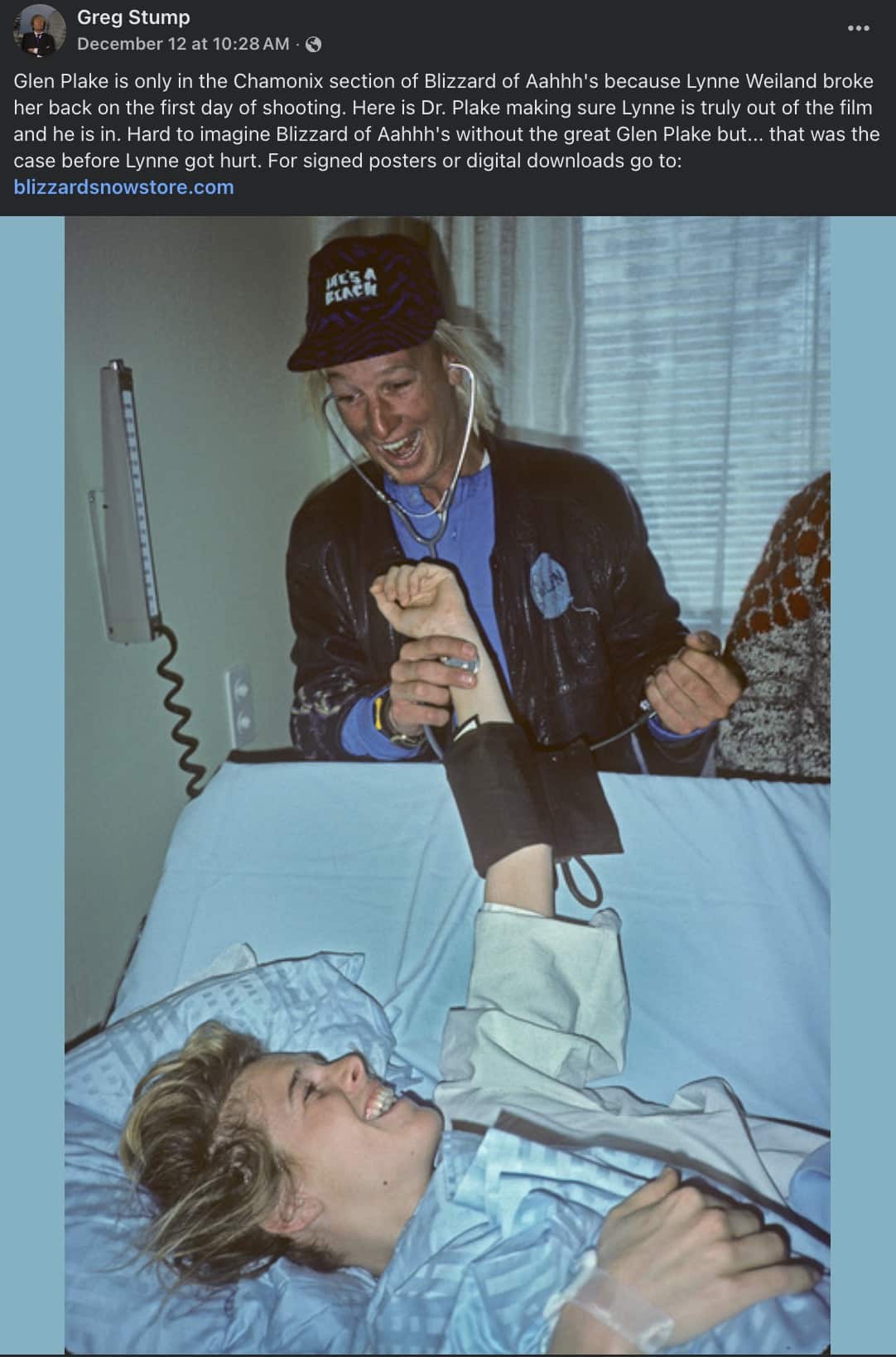 Recently, Greg Stump has been sharing stories of the production of the Blizzard of Aahs. One such story is how Plake got into the film. Originally, the plan was to feature Lynne Weiland in the Chamonix section rather than Plake. Weilland was an acclaimed skier herself, as she was a stunt double in Hot Dog… The Movie. However, she suffered a major injury on the first day of filming Blizzard. Doctor Plake came in to fill her role, and the rest is history.