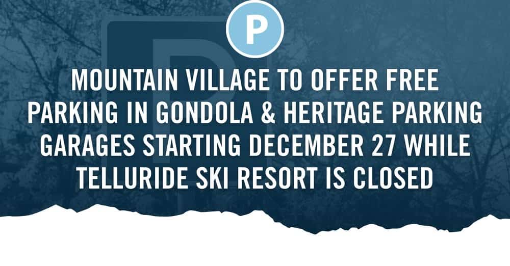 “In an effort to support Mountain Village businesses during the ski patrol strike and ski area closure, the Town of Mountain Village will be offering free day parking in the Gondola Parking Garage, Heritage Parking Garage, and the Meadows Lot beginning on Saturday, December 27 for the duration of the resort closure. Standard hourly rates will still apply in North and South Village Center lots. Overnight parking fees in Gondola Parking Garage and overnight marking rules in the Meadows will still apply. The gondola and the chondola will run on regular schedules during the ski area closure. No mountain access will be allowed from Station San Sophia during the closure.” -Town of Mountain Village