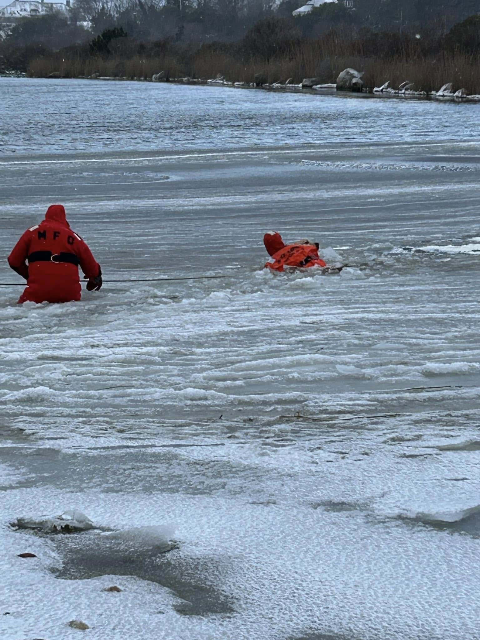“No ice is ever safe. Our firefighters train extensively for cold water and ice rescues, but these situations are extremely dangerous. All of the Chiefs from Misquamicut Fire Department and Watch Hill Fire Department extend kudos to everyone involved for their quick response and teamwork this morning.” –Misquamicut Fire Department