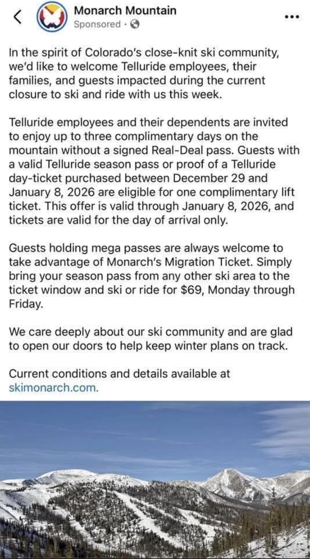 Monarch Mountain recently announced that it is offering Telluride employees and their dependents up to three days of free skiing. Also, if you have a Telluride season pass or day ticket purchased between December 29th and January 8th, you get a free day of skiing or riding at Monarch.