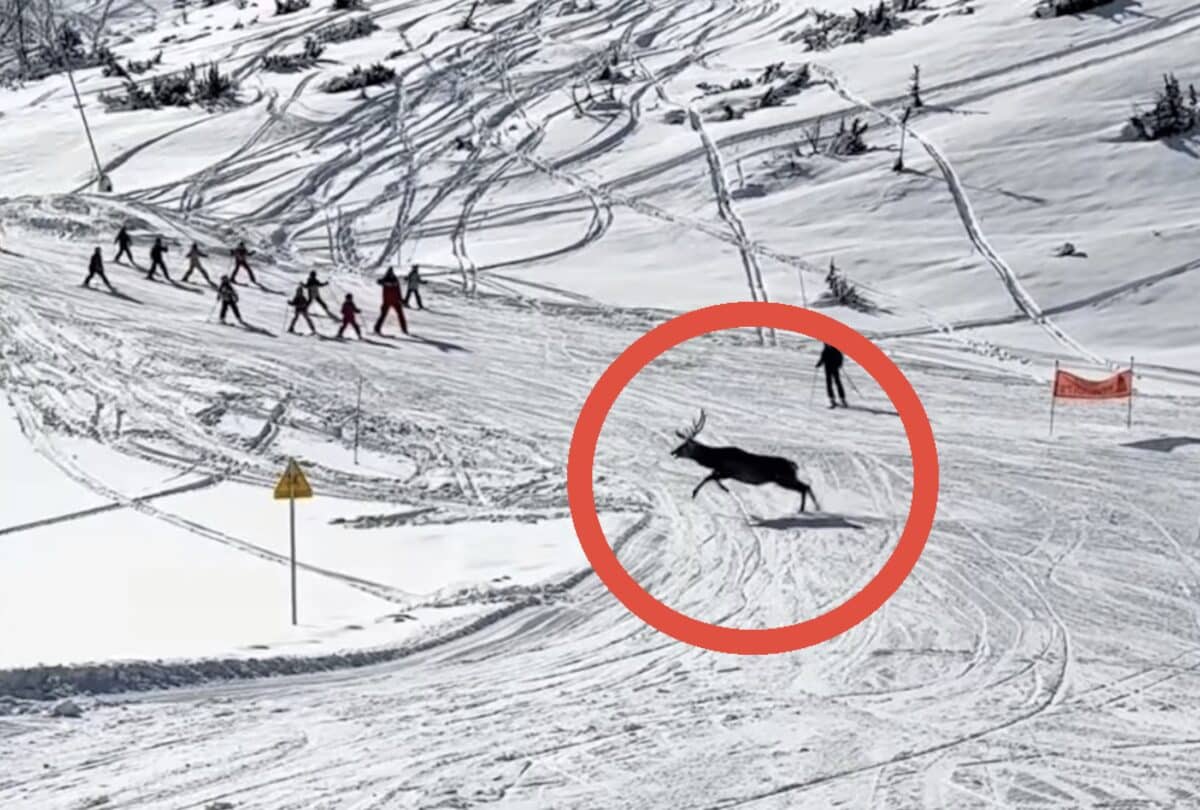 Incredible footage from the French Pyrenees where a group of ski schoolers had a close encounter with a Red Deer buck on the slopes of Val-Louron Ski Resort.
