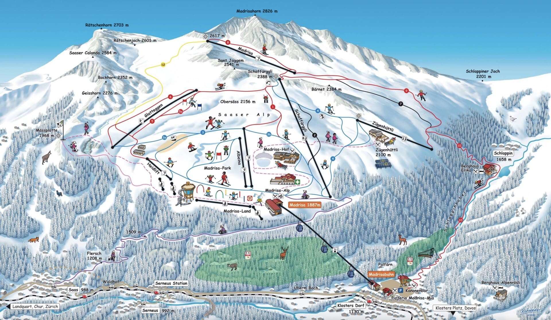 Overall, the resort comprises six separate ski areas. For the most tenured skiers, Pischa is the go-to choice, as there are no groomed runs there. Parsenn is great for carvers, as it’s home to one of Switzerland’s longest ski slopes. Schatzalp-Strela is a historic, relaxed ski resort that inspired The Magic Mountain. Madrisa is the ideal mountain for families. Rinerhorn is described as a hidden gem for families and also features night skiing. The newest run is situated at Jakobshorn, with a 1000 km vertical drop that ski racer Jasmine Flury loves.