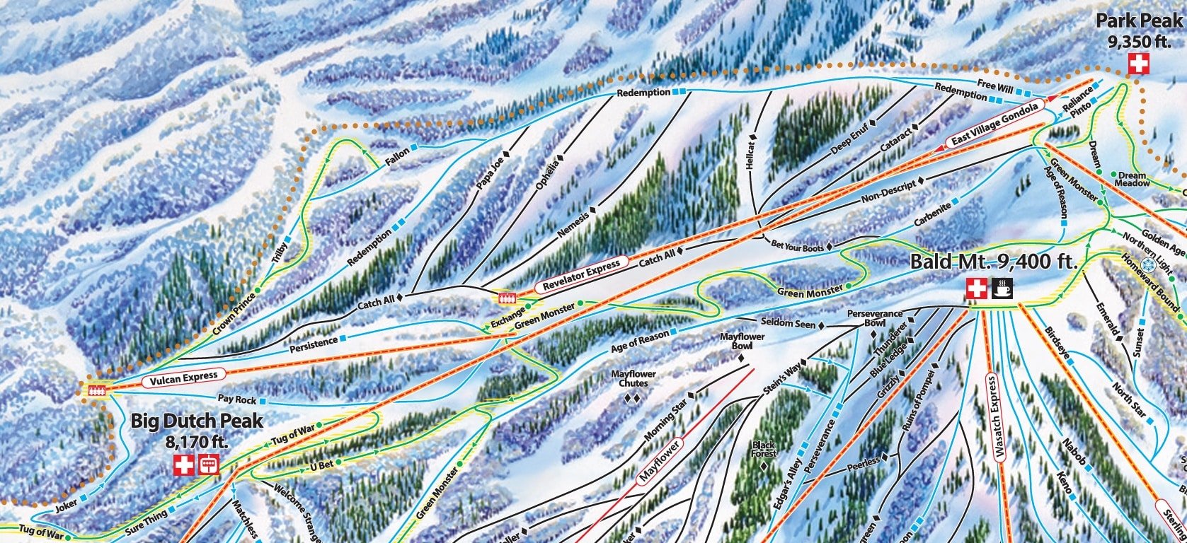 The Revelator Express is a high-speed quad that serves the steepest terrain in the expansion (until South Peak eventually opens). This takes skiers up to near the summit of Park Peak. It also services Redemption, which may now be Deer Valley Resort’s signature run. If you want to ski all of Redemption, it’ll take you back down to the base of the Vulcan Express. On powder days, advanced and expert skiers will love Cataract, Deep Enuf, and Hellcat.
