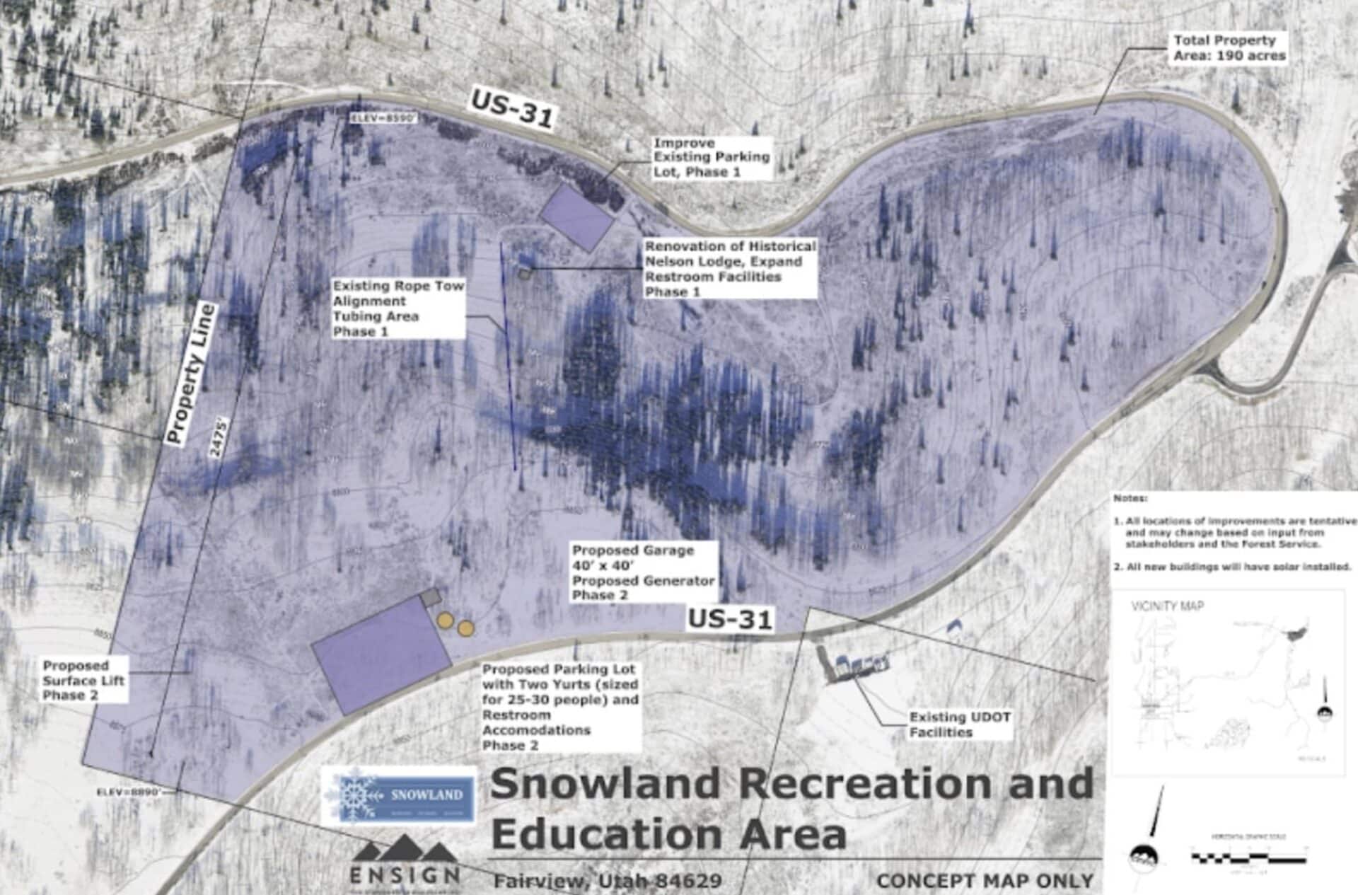 Future phases could include a parking lot at the top of the hill, two yurts (available for overnight rentals), a restaurant, an outdoor concert space, and a third surface lift (a T-Bar) with carriers for mountain bikes. For that surface lift, the ski area has secured a $1.46 million grant via the Utah Division of Outdoor Recreation. The goal is to have everything in place at Snowland by the 2027-28 season.