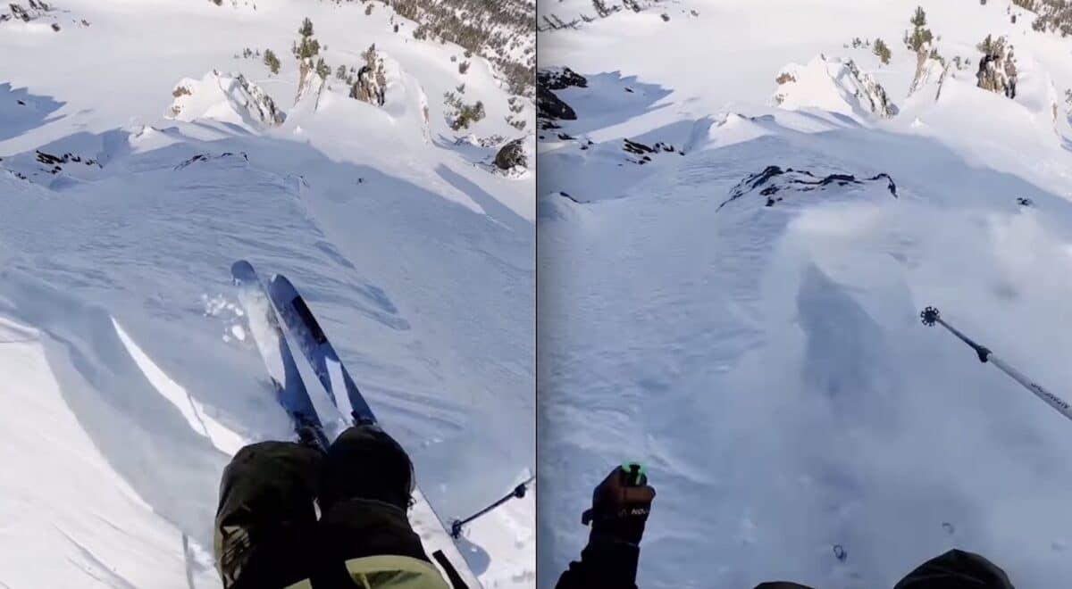 This incredible line starts with a heart pounding moment as he looked over the edge. The cornice he was standing and about to launch off gave out under his feet, causing him to fall to his hip on the snow beneath.