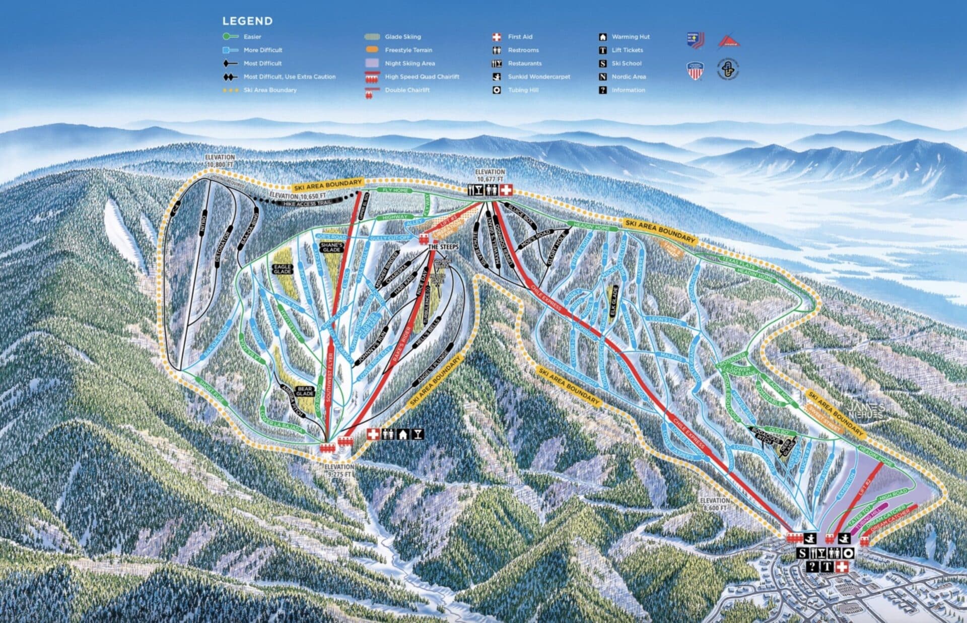 Angel Fire Resort: A lot of changes came to Angel Fire this winter, and more improvements are on tap for next winter. The marquee addition for this winter is seven new trails, including the ski resort’s first double black diamonds. Other additions at the New Mexico ski resort include a new fixed-grip quad chairlift (which serves The Steeps), a new covered conveyor lift, snowmaking upgrades, new snow groomers, additional parking, and more. As of 2026, the ski resort features 95 trails, 8 lifts, and a vertical drop of 2,077 feet.