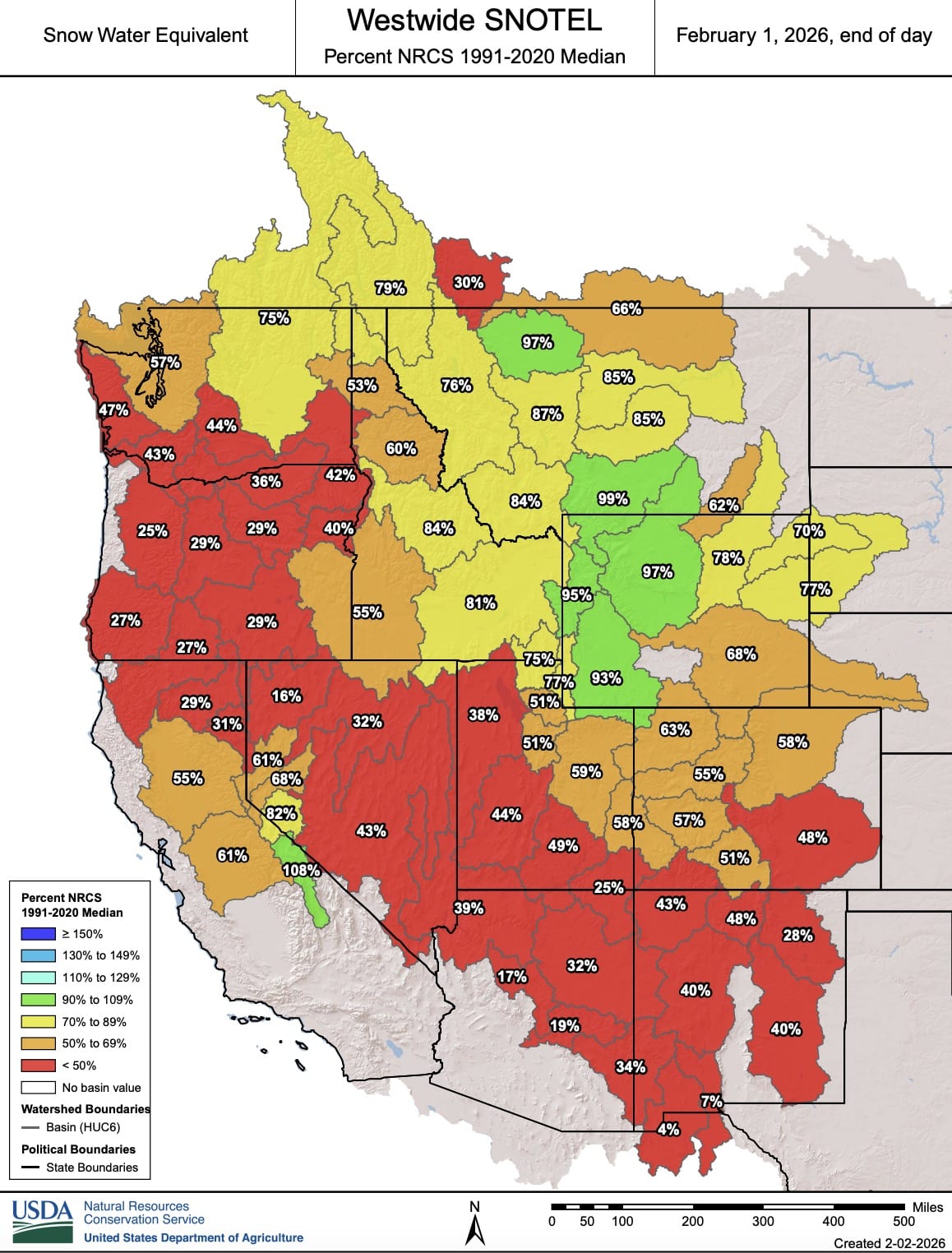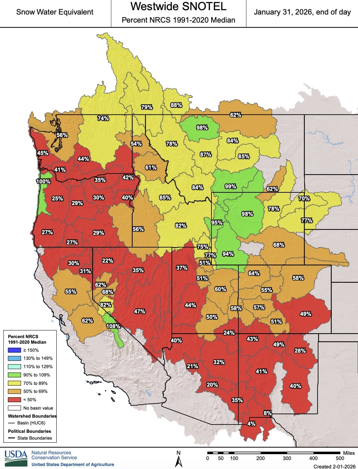 As indicated by the January 31st Westwide SNOTEL, published on February 1st, the snowpack is abysmal. Various sites are at or near record lows. The only areas that appear to be doing well are Wyoming and parts of Montana.
