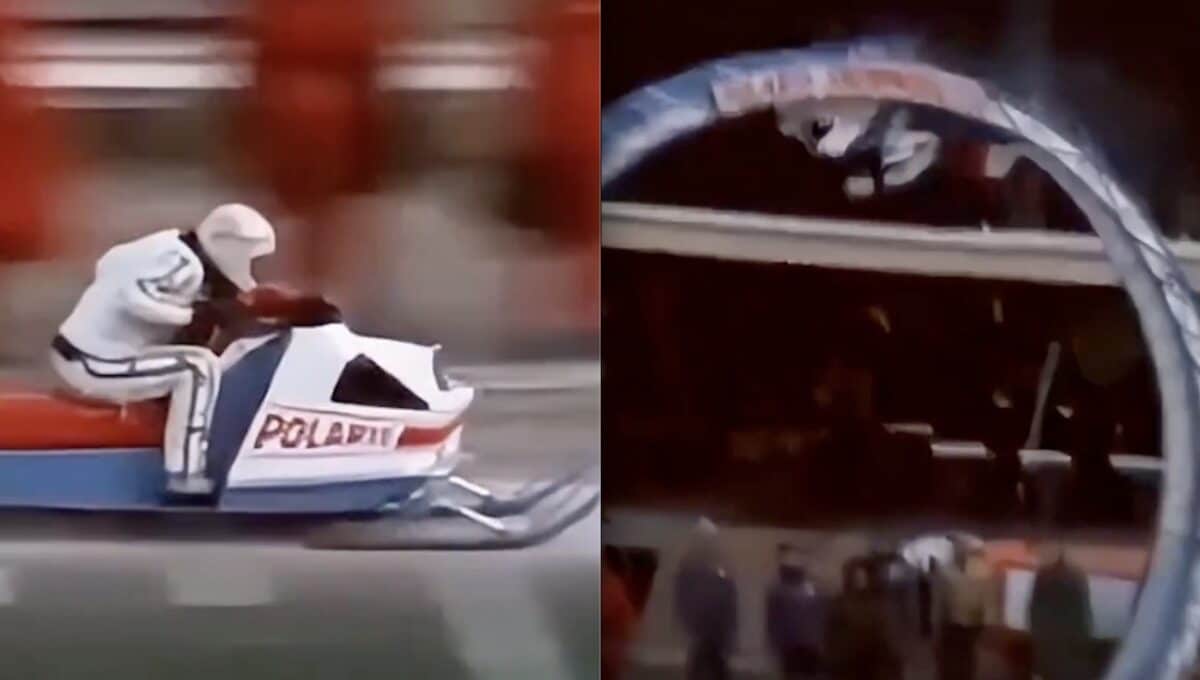 The following loop-de-loop stunt was performed at a regular season Vikings game on December 10th, 1970. If you are familiar with how late model snowmobiles perform, it makes it all the more impressive: