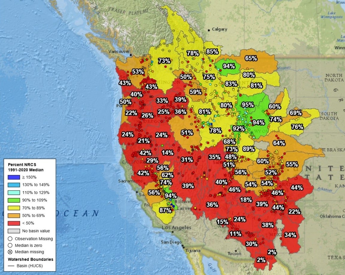 USDA NRCS data comparing current snow water equivalent to the 1991–2020 median shows massive swaths of the West sitting well below average, with many river basins under 50% of normal and large areas in California, Nevada, Arizona, New Mexico, Utah, and parts of the central Rockies dipping into the 20–30% range. The map is dominated by red. Even traditionally reliable snow zones have struggled to stay near average, while much of the Southwest looks more like late April than mid-winter. Federal snow monitoring has shown that snow-covered area across the West dropped to roughly 34% of the long-term average at one point this season — the lowest in the satellite record — underscoring just how widespread and abnormal the lack of snow has been throughout the Western Ski Season.