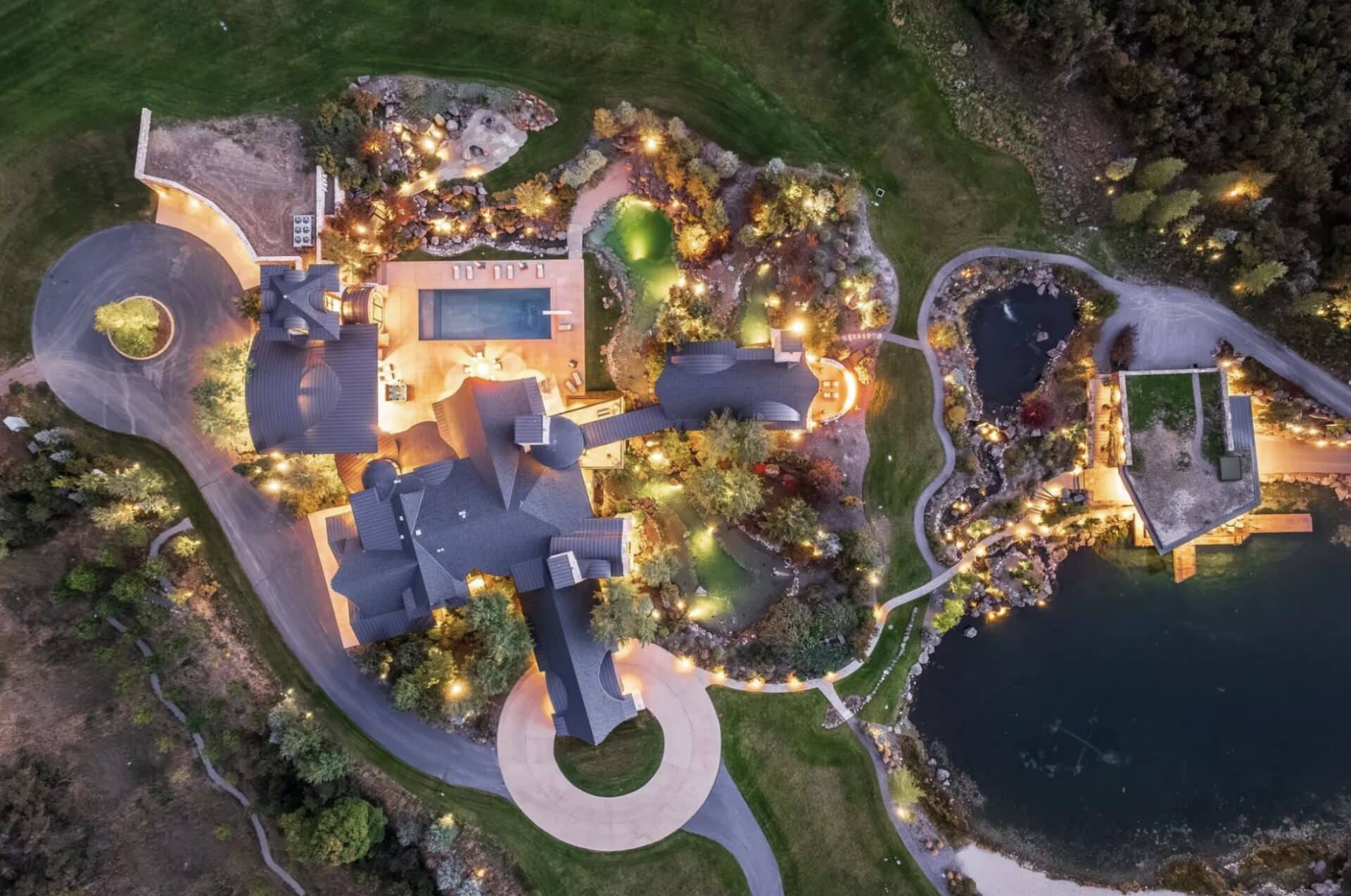 With 23,000 square feet in the main residence, a 6,200-square-foot guest house, waterfalls, ponds, reclaimed timber, and massive stonework quarried in Utah, the property blends old-world mountain presence with refined modern design.