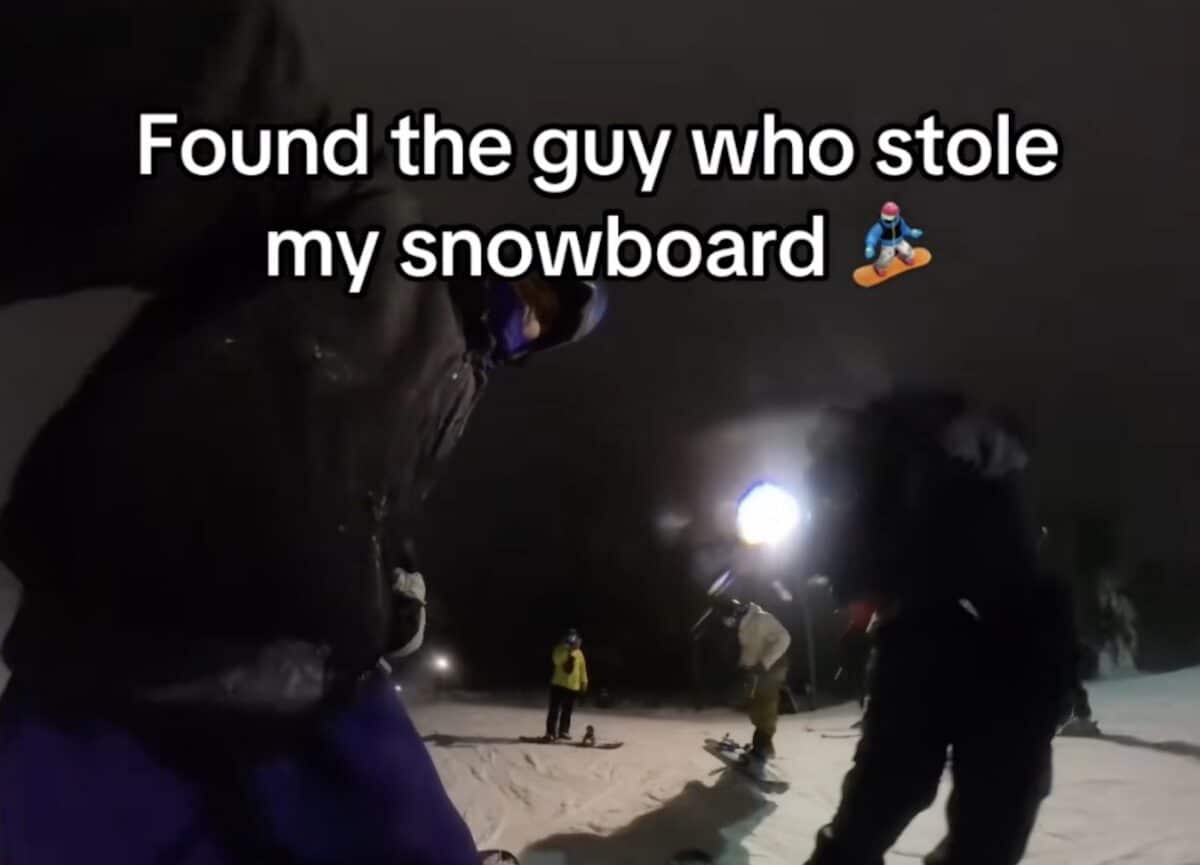 In a video circulating online, a rider can be seen in a tense confrontation with another snowboarder at an unloading area of a chairlift. After a quick exchange, he physically reclaims his stolen board and rides off, leaving the other rider without a board and presumably without a clear way down the mountain.
