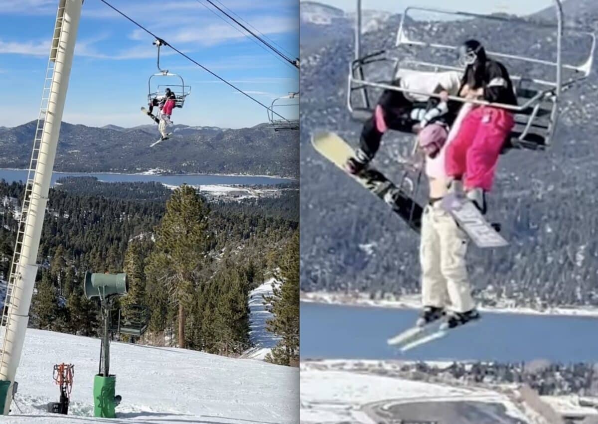 San Bernardino National Forest, California — A terrifying moment unfolded on the slopes of Big Bear Mountain in Southern California where a skier somehow slipped under a chairlift safety bar and was left dangling high above the ground as the chair continued towards the top station.