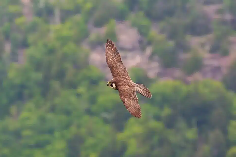 For centuries, peregrine falcons hunted the skies of the world, displaying their impressive in-flight hunting tactics. Imagine this crow-sized raptor flying high above its quarry, then diving (“stooping”) to attack prey at a speed of more than 100 miles per hour. Imagine the prey being struck to the ground or even killed in flight by the tremendous impact from the peregrine’s outstretched talons. Imagine witnessing a peregrine tail-chasing a dove between Dorr and Cadillac Mountains.