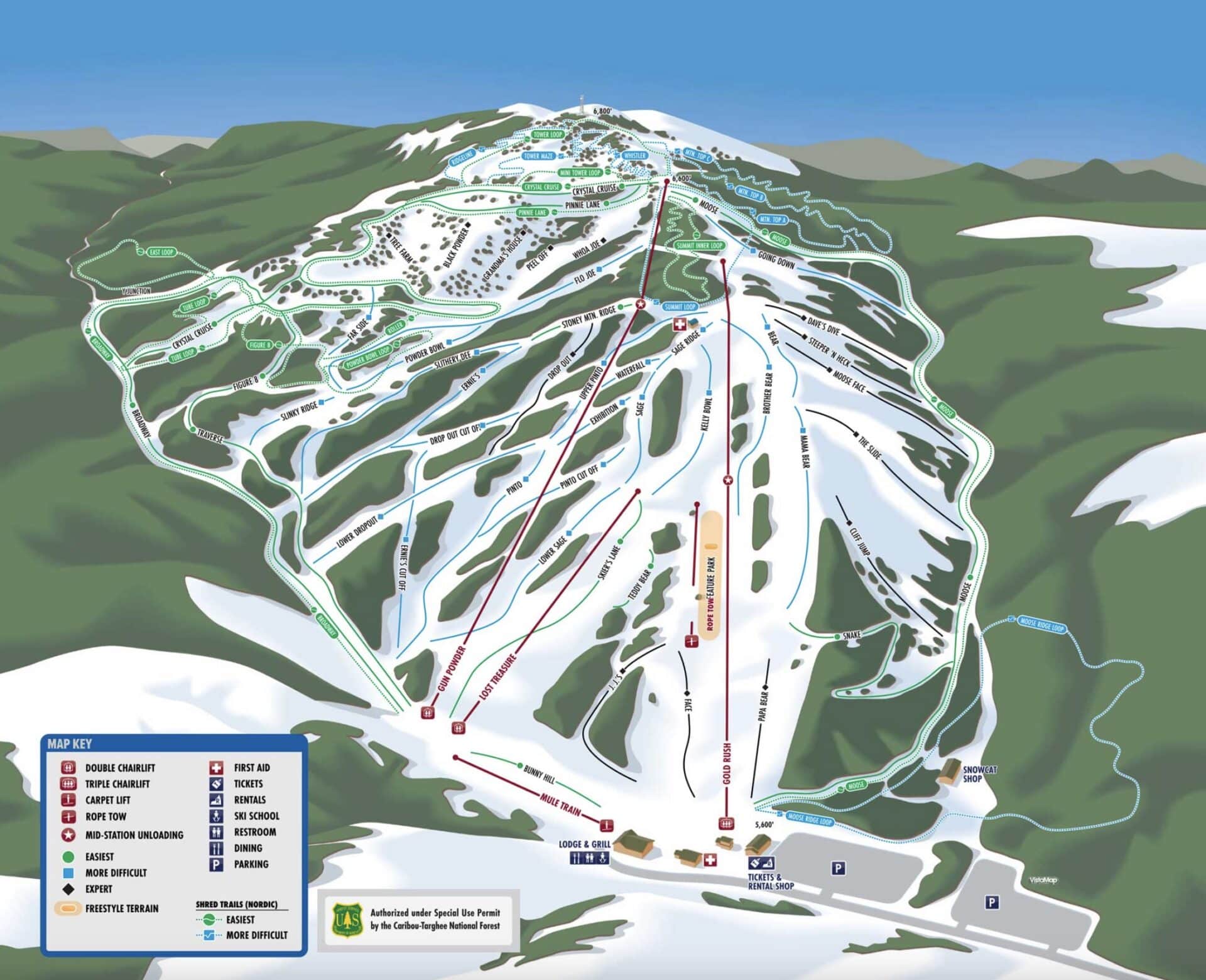 Some of the upgrades for the 2025-26 season include new trails, adding a rope tow to the terrain park, and opening a hamburger restaurant (Big Jud’s) at the base lodge. Prior to the rope tow, the most recent lift addition was the Goldrush chairlift. This SkyTrac triple chairlift was installed in 2021.