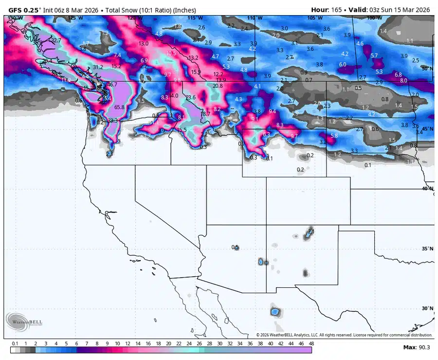 Below: Powder map from Sunday (3/8) to Thursday (3/12). Snow fills into the northern Cascades and the southern interior of BC, short-term (Cold front). The period from Wednesday to Thursday peaks these numbers up several feet (Date and day in upper right of map).