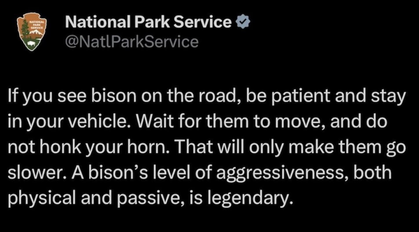The National Park Service just issued a zinger of a public service announcement warning motorists not to honk at bison as it only make them move slower due to their legendary level of passive aggressiveness: