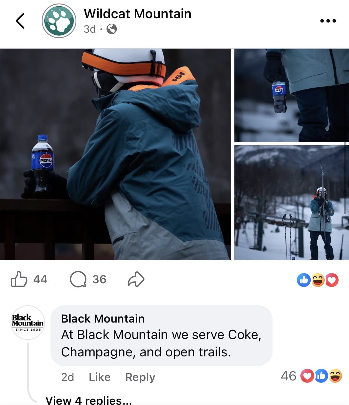 Black Mountain chimed in on the Facebook comments section, stating that they have champagne, Coca-Cola, and more open trails. Boom, roasted.
