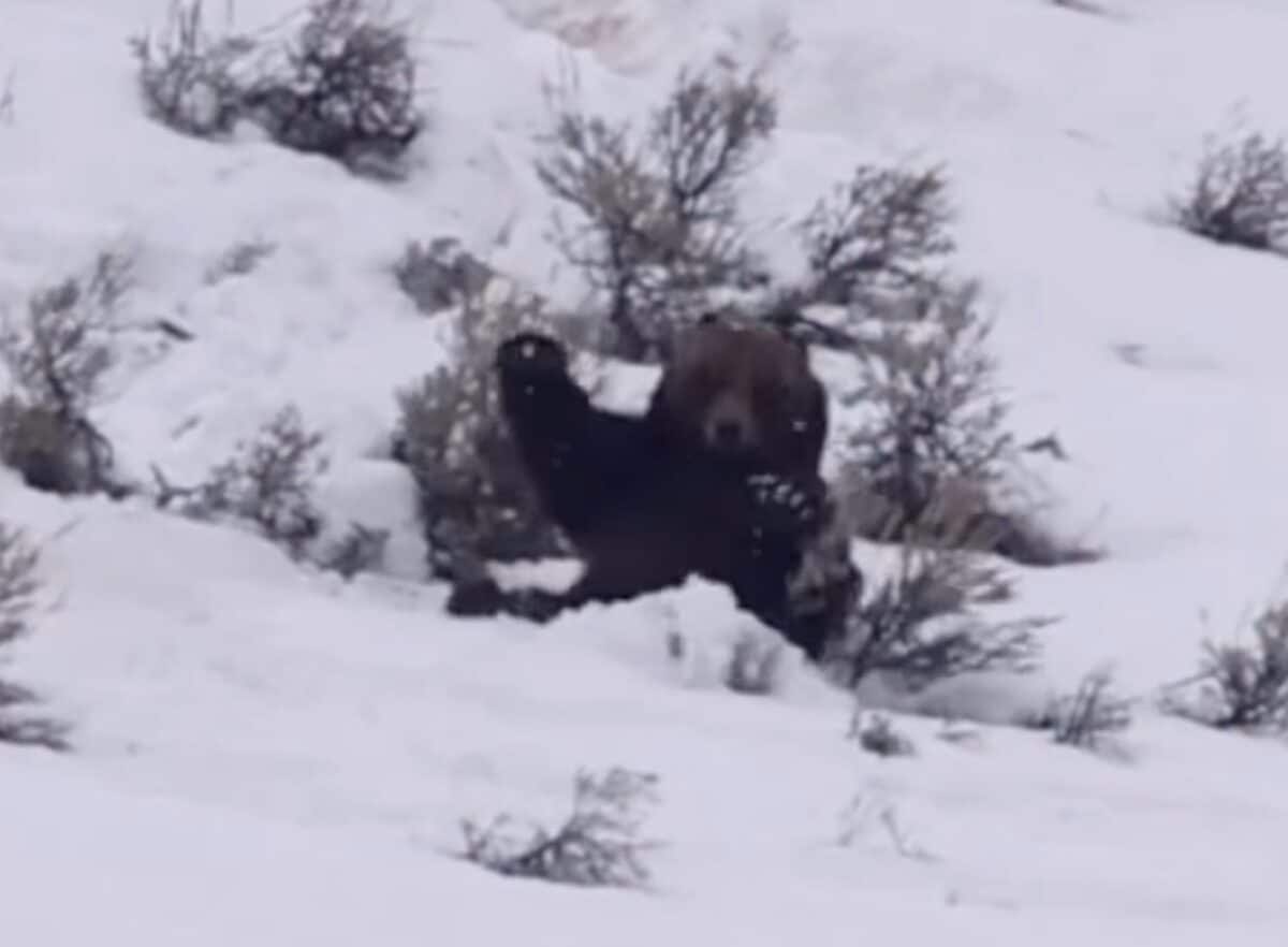 Yellowstone — Humankind will never know what its like to wake up from 7 month hibernation but this grizzly bear in Yellowstone National Park offered a glimpse. After emerging from its winter den, the groggy bear shook off the cobwebs with a series of somersaults and leg stretches that would impress even the most dedicated yogi.